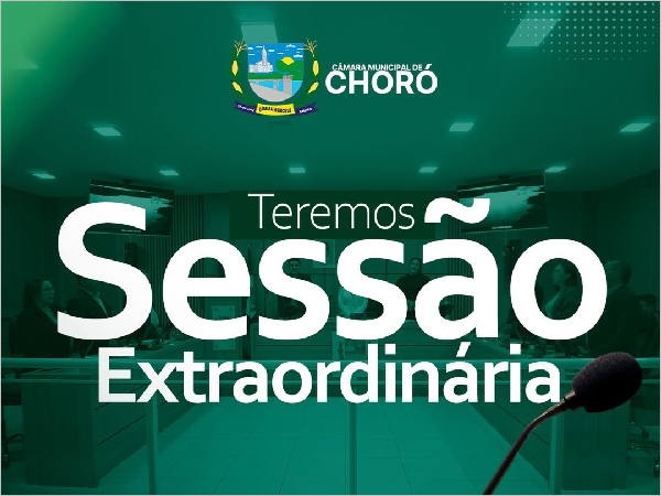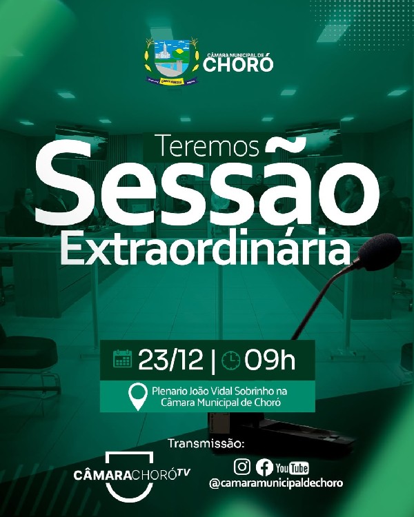 A Câmara Municipal de Choró realizará a 3ª Sessão Extraordinária nesta terça-feira, dia 23 de dezembro, às 9h, no Plenário João Vidal Sobrinho.