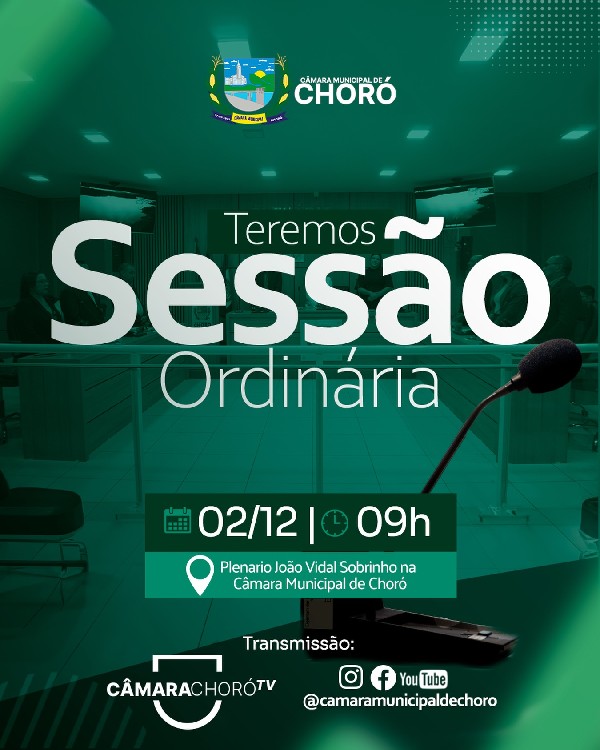 A Câmara Municipal de Choró realizará a 42ª Sessão Ordinária nesta terça-feira, dia 02 de dezembro, às 9h, no Plenário João Vidal Sobrinho.